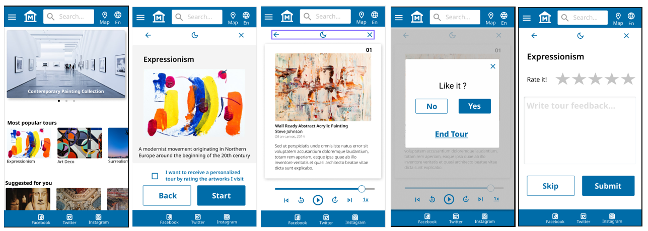 Using the completed set of digital wireframes, I created a low-fidelity prototype. The primary user flow I connected was to start a guided tour and to offer likes / dislikes for each artwork.